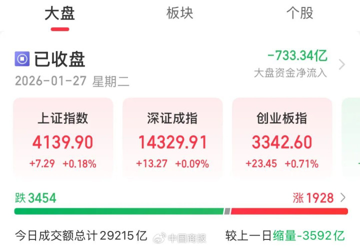 转自:中国商报 中国商报(记者王彤旭)1月27日,A股三大指数集体上涨。截至收盘,沪指涨0.18%,深成指涨0.09%,创业板指涨0.71%,北证50指数跌0.05%。沪深京三市成交29215亿元,较上一日缩量...
